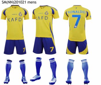 Al-Nassr navy blue and yellow kit with KAFD sponsor, Ronaldo #7.